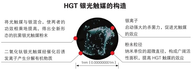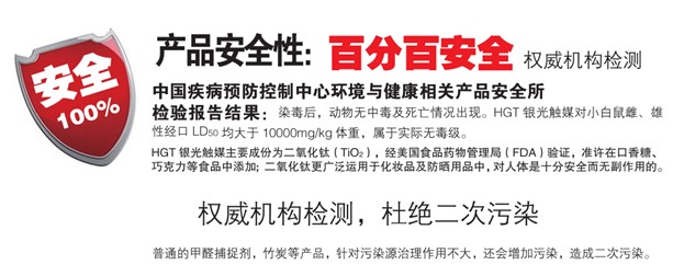 HGT銀光觸媒:超越普通光觸媒的HGT納米技術,將二氧化鈦(TiO2)與銀離子混合,啟動強大的殺菌力,二氧化鈦催化后誘發(fā)離子產(chǎn)生分解有機物,再配合植物提取液的復合威力,對細菌、霉菌發(fā)揮強力的抗菌效果,分解臭味、TVOC等,并能夠在自然條件下起催化反應,產(chǎn)生氫氧自由基和活性氧,將污染物直接分解為二氧化碳和水。產(chǎn)品一經(jīng)噴涂,便能在物體表面形成HGT銀光觸媒薄膜,迅速起到吸附分解功能,邊吸咐邊分解,去除甲醛、苯、氨、TVOC等有害氣體,可在一分鐘內(nèi)去除異味、凈化空氣。